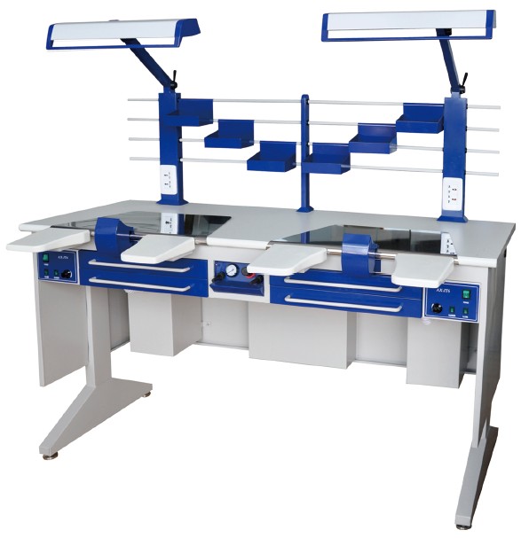 The AX-JT6 Workstation is designed by Aixin and Bowon Dental from Korea, and is developed for the East Asian markets. The table frame is made of steel, and the tabletop is made of high density fireproof board. It also features florescent lighting system, stainless steel plate, arm rests, retrievable air nozzle, dust extraction system, storage drawers, etc.