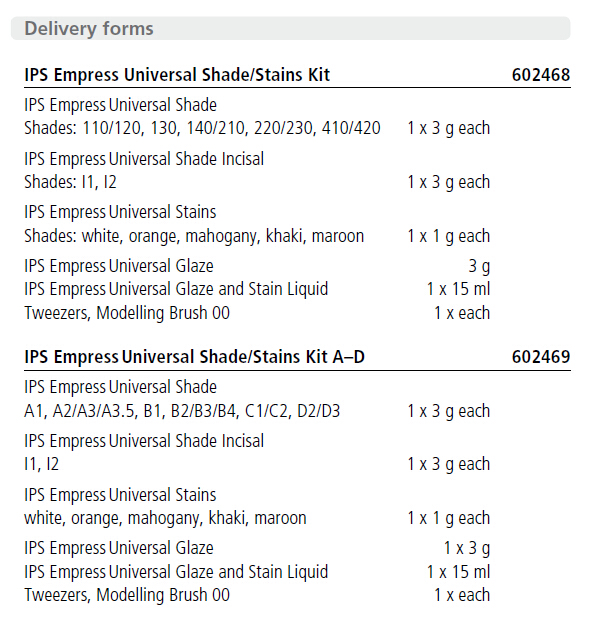 IPS Empress® Universal Shade/Stains Kit The IPS Empress Universal Shade/Stains Kits (Chromascop and A–D) contain a selection of the most popular Dentin and Intensive Stains. These stains can be used to apply surface staining and characterization. The Kit also contains a smooth and fine-grained glazing paste for final glazing of the IPS Empress restorations.