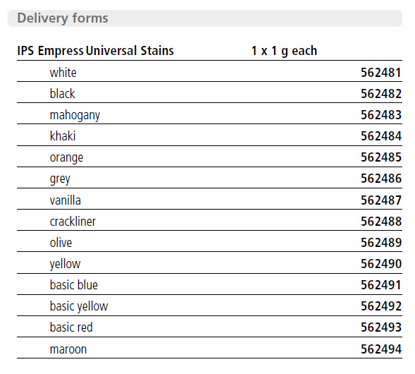 IPS Empress® Universal Stains The intensive stains are available in 14 different shades.
