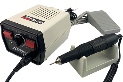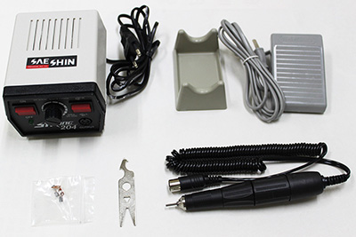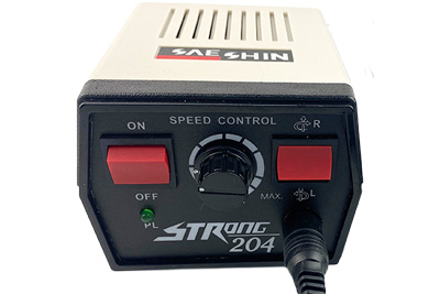 MM12 Micro Motor Saeshin STRONG 204/102L RPM : MAX 35,000rpm Input: 220V 50HZ Weight : Control box 1.7kg Right & Left turning abillity Hand/ Foot speed control system Foot speed pedal or Foot On-Off pedal-Option