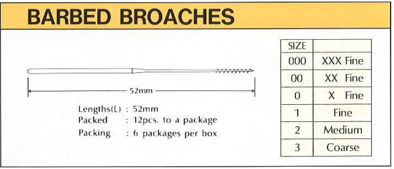Fully elastic barbed broaches with bards enable to pull out debris or residues easily.