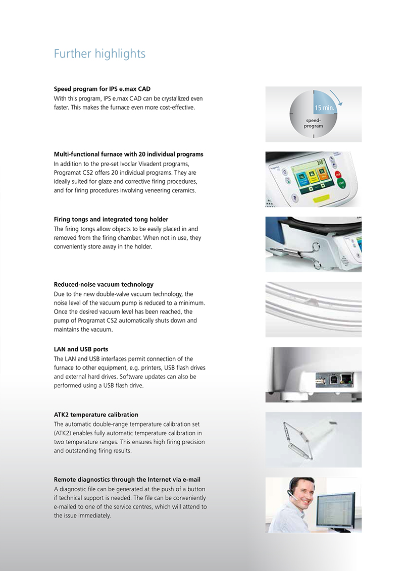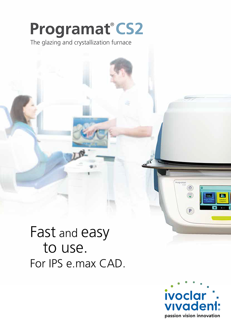 The device has been specially developed for the crystallization of IPS e.max CAD restorations. The Programat CS2 is easily operated by means of the new colour touch screen and the proven membrane-sealed keypad. It is furthermore equipped with 20 individual programs as well as predefined Ivoclar Vivadent programs, such as the Speed program, which crystallizes IPS e.max CAD restorations in less than 15 minutes.