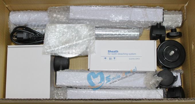 -LED bleaching system assessories are power cord*1, mouth sheath*20, Glass*2; user manual*1, Remote control*1